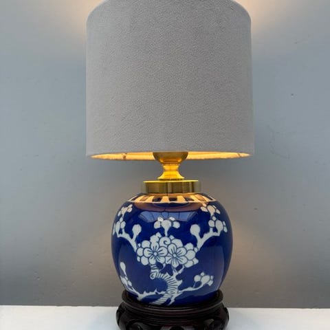 Bordlampe af glaseret porcelæn og messing med træfod, fremstillet i Japan omkring 1980–1990, højde 36 cm, skærm Ø 20 cm, fod Ø 13 cm; god stand med let ældre tegn, i drift og giver varmt lys. Klik på den blå "gå til varen" knap, for at købe eller byde på denne vare. Den samlede pris vil blive vist inden du afgiver dit bud.