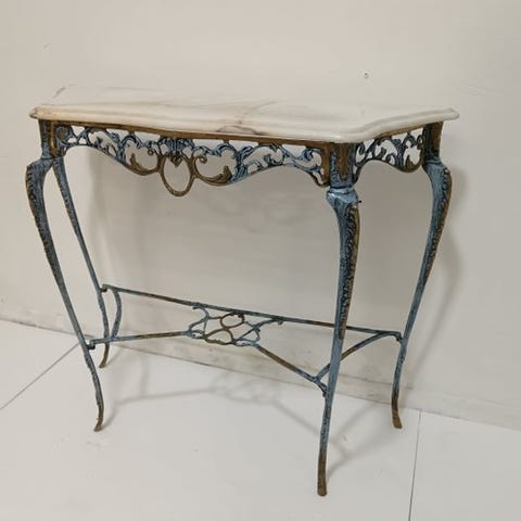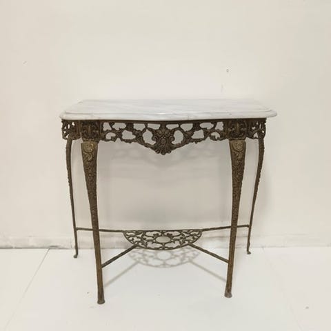 Bronze konsolbord med hvid marmorbase, fremstillet i Frankrig, dateret 1980–1990, målene 90 cm i bredde, 74 cm i højde og 40 cm i dybde, i meget god stand med få aldersrelaterede tegn. Klik på den blå "gå til varen" knap, for at købe eller byde på denne vare. Den samlede pris vil blive vist inden du afgiver dit bud.