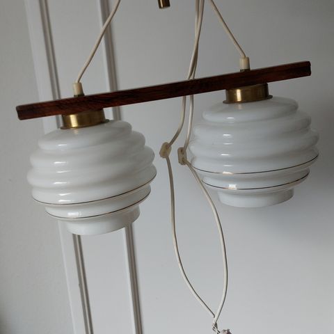 Tung kvalitet dobbelt hængelampe fra E.F. Frantzen, Italien. Til over et bord / spisebord eller snooker-, pool-, billard- eller biblioteksbord. Justerbar. To elegante arme af børstet kobber forbinder enden med runde glas-skærme i mælkhvid. Alt fungerer optimalt. Sparepærer / LED anvendelig.