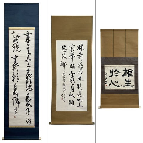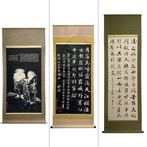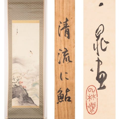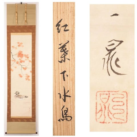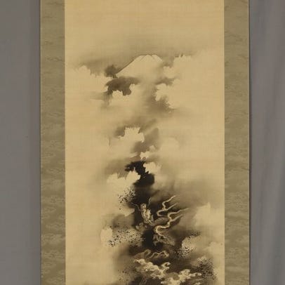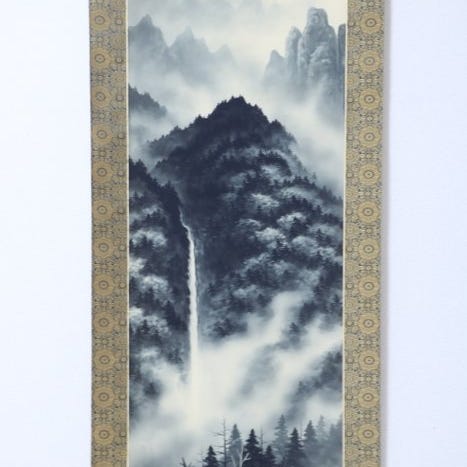 Ink Waterfall af Takebe Hakuho (1871–1927), Taishō-perioden, blæk på papir i lodret rulle, samlet højde 207 cm og bredde 31,2 cm (motivets mål 120,5 × 28,7 cm), underskrevet af kunstneren Hakuho (白鳳), i rimelig til dårlig stand med brændingsmærker, pletter, sammenkrøllede og skadde områder i ophænget, monteret i silke med bambus-ender og Tomo-Bako kasse med kunstnerens inskription. Klik på den blå "gå til varen" knap, for at købe eller byde på denne vare. Den samlede pris vil blive vist inden du afgiver dit bud.
