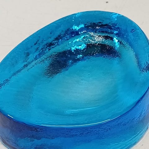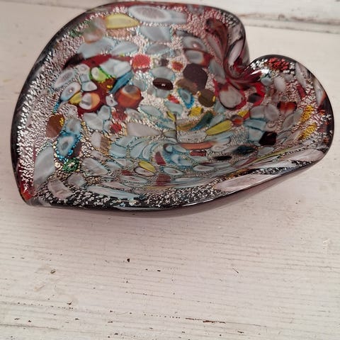 Et tungt grønt firkantet skål af Murano-glas med 'Tutti Frutti' dekoration indeni. Denne dekoration består af en række forskellige farver og former af glas. Skålen er ikke mærket (se billederne).