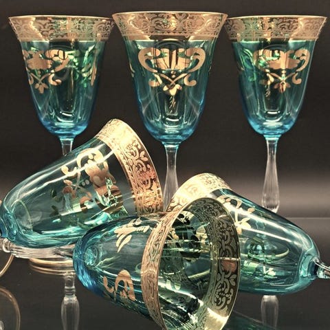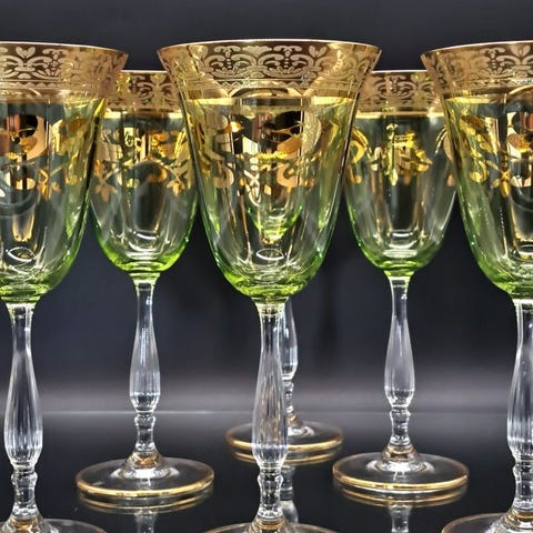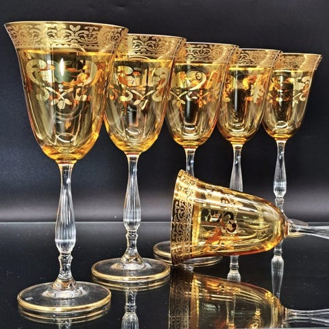 Seks moderne krystalvinsglas fra Artemisia Bohemia Firmati, dekoreret med blått 24 kt guld, Bohemsk krystal håndlavet i Italien, højde 20 cm, diameter 9 cm, oprindelse Republi ken i Tjekkiet, i fremragende stand. Klik på den blå "gå til varen" knap, for at købe eller byde på denne vare. Den samlede pris vil blive vist inden du afgiver dit bud.