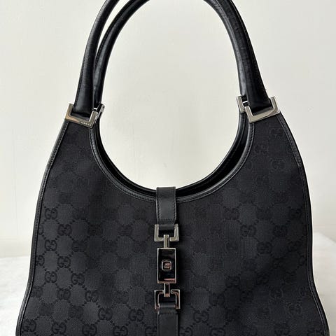 Gucci Jackie canvas skuldertas i sort med sølvfarvet metalhardware, 14 cm høj, 26 cm bred, 4 cm dyb, inkluderer dustbag, i god brugt stand. Klik på den blå "gå til varen" knap, for at købe eller byde på denne vare. Den samlede pris vil blive vist inden du afgiver dit bud.