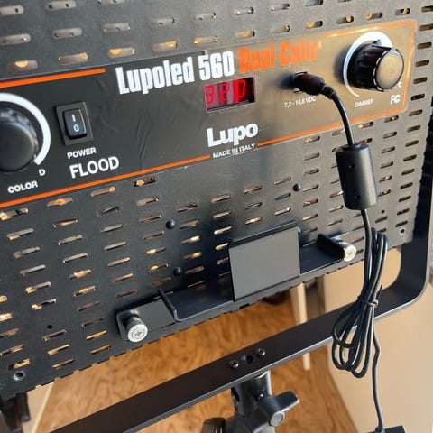 LUPOLIGHT LED-lyslampe til gaffelmontering med dæmper, med 560 LED med høj farvegengivelse (CRI>94), beslag til montering på stativ eller klemme, portplade og dedikeret 24V-strømkilde.