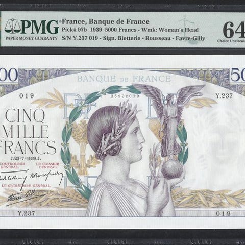 1947 prøvekort af 100 Livres fra det franske protektorat, Pick 61s, bedømt Extremely Fine 40 og certificeret, højre kant tilføjet og mindre pletter. Klik på den blå "gå til varen" knap, for at købe eller byde på denne vare. Den samlede pris vil blive vist inden du afgiver dit bud.