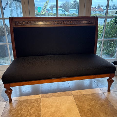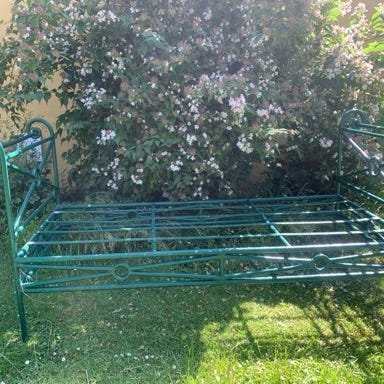 Raffineret eksempel på håndværk og dekorativt design, denne smukke to-personers divan i smedet jern stammer fra tredserne. Fremstillet i håndsmedet jern, skiller den sig ud med sine elegante, kurvede linjer, den lette elegance i strukturen og detaljernes omhu, som tydeligt henviser til den franske indflydelse fra perioden.