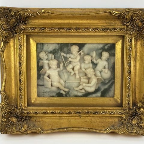 Par ovale dekorative plader i træ i rokoko-stil, hver 35 × 28 cm med gyldent ovalt ramme, i god brugt stand med let slitage og en dybde på 3 cm, dateret ca. 1930–1940, sælges som par. Klik på den blå "gå til varen" knap, for at købe eller byde på denne vare. Den samlede pris vil blive vist inden du afgiver dit bud.