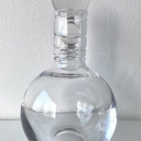 Tidløst design, tungt gennemsigtigt krystal med en kerne af lyserød og tre slebne ribber. Signeret RLC/CR/2010/18 (Royal Leerdam Crystal / Carina Riezebos.