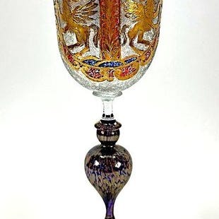 Murano håndblæste glasvinglas i næsten ny stand, fra Italien og dateret til 1950–1960, cirka 25 cm høj og 11 cm bred, med applikationer i blondemateriale og en gylden kordondel, muligvis tilskrevet Barovier & Toso. Klik på den blå "gå til varen" knap, for at købe eller byde på denne vare. Den samlede pris vil blive vist inden du afgiver dit bud.