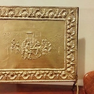 Antik Victorian-inspireret pejseskærm fra Frankrig, cirka 1900–1910, smedet i messing og massivtræ med håndlavet uldbroderi af farverige blomster på mørk baggrund, dimensioner 84 x 46 x 23 cm, i god stand med få brugsspor. Klik på den blå "gå til varen" knap, for at købe eller byde på denne vare. Den samlede pris vil blive vist inden du afgiver dit bud.