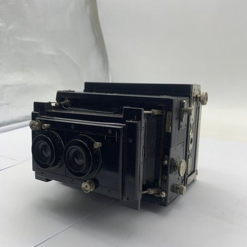 En mere end hundrede år gammelt mahognipladekamera til formatet 18x24. Med klart Goerz Dogmar 4,5/19,5 cm objektiv med velfungerende blænde. Den grønne balg har lærforstærkede hjørner, er i god stand og virker lyddækket. Træværket og messingbeslaget er også i pæn stand.Tidligere har den sandsynligvis været rengjort og restaureret. Ingen manglende dele og alt fungerer som det skal. Et tungt og solidt bygget kamera (vejer 5 kg). Ingen mærkeangivelse, men efter al sandsynlighed et tyskt fabrikat. Ud fra modellen og kvaliteten er det sandsynligvis Ernemann. Med kameraet medfølger en flot og passende mahognifarvet dobbelt pladeholder. Pragtfuldt kamera til vådpladefotografi. Billederne udgør en del af beskrivelsen.