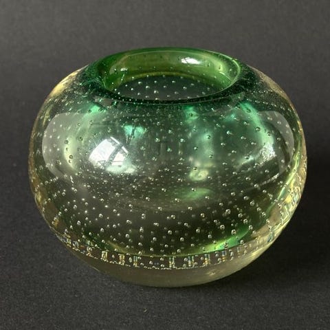 Glas Spijkerbol-model fra Nederlandene, designet af A.D. Copier (Leerdam Glasfabriek), ca. 1930–1940, diameter 7 cm, højde 7 cm, dybde 7 cm, vægt 500 g, i god stand med mindre ældningsspor og pletter. Klik på den blå "gå til varen" knap, for at købe eller byde på denne vare. Den samlede pris vil blive vist inden du afgiver dit bud.