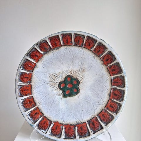 Belgisk keramikfad af Jan Nolf, dateret til 1960-1970, med polykromt reliefdekoration, i god stand og med en diameter på 21 cm. Klik på den blå "gå til varen" knap, for at købe eller byde på denne vare. Den samlede pris vil blive vist inden du afgiver dit bud.