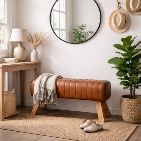 Forvandl dit opholdsrum med denne smukt designede Pommel Horse Ottoman-bænk. Fremstillet af førsteklasses læder har dette unikke møbel et moderne look, der kombinerer både komfort og stil. Det fyldige brune læderbetræk tilføjer et sofistikeret præg til ethvert rum, mens de naturlige træben giver designet en jordnær, rustik charme.