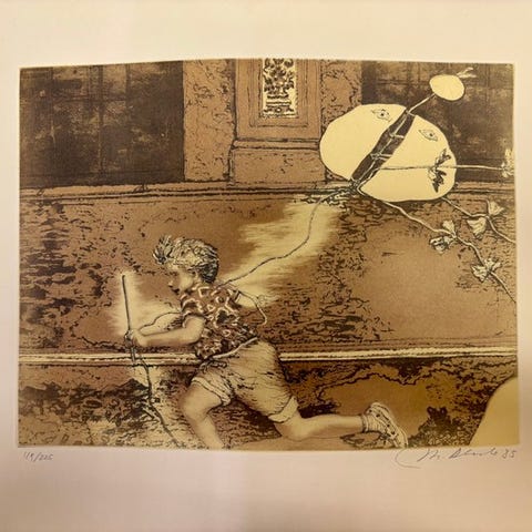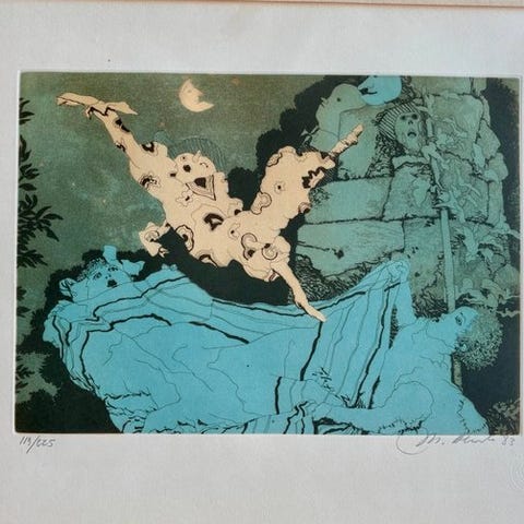 Manuel Alcorlo præsenterer JUEGOS III (LA RAYUELA), et mixed media-værk i aguaforte og aguatinta, lavet i 1984, 38,30 cm høj og 53,50 cm bred, udgave 134/225 i en samleudgave på 225, håndsigneret, produceret i Spanien og tilbudt af Galería, periode 1980–1990. Klik på den blå "gå til varen" knap, for at købe eller byde på denne vare. Den samlede pris vil blive vist inden du afgiver dit bud.