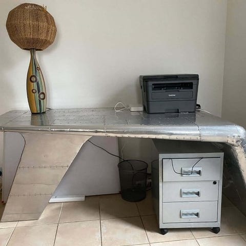 Airbus A320 coffee table fremstillet af segments af en Alitalia Airbus A320-fuselage med en stålramme og ben i pudderlak, sænket med Suede Minster-læder, 10 mm hærdet glas top fastgjort med glasadaptere og målene 160 x 86 x 40 cm; showroom-model, aldrig brugt, fra Nederlandene. Klik på den blå "gå til varen" knap, for at købe eller byde på denne vare. Den samlede pris vil blive vist inden du afgiver dit bud.