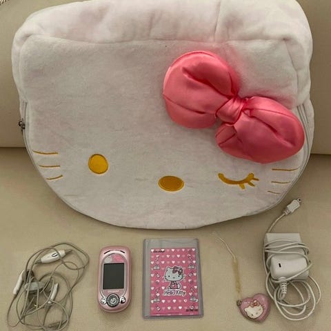 Okwap x Hello Kitty 30-års udgave-telefon, udgivet i 2004, med oplader, øretelefoner og etui, vintage, virker ikke længere.