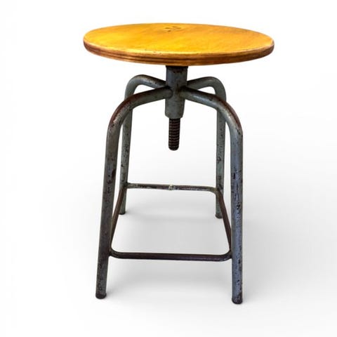 Justerbar drejelig arbejdsskammel med træSæde og stålfod, fremstillet i Italien, cirka 1970–1980, højdemålt mellem 66 og 78 cm, vægt 4,3 kg, vintage stil, i god brugt stand med mindre aldersmærker og pletter. Klik på den blå "gå til varen" knap, for at købe eller byde på denne vare. Den samlede pris vil blive vist inden du afgiver dit bud.