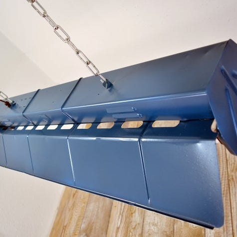 Polsk industriel lampe 3x T8 LED 120cm. Lampen er blevet restaureret og er i perfekt stand. Den er omdannet til energibesparende LED-flyderlamper på 120 cm. Vi har flere af disse lamper. En fantastisk industriel lampe, der passer ind i enhver indretning, fin til over spisebordet, værkstedet, poolbordet, baren eller restauranten.