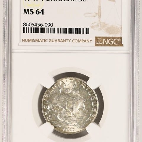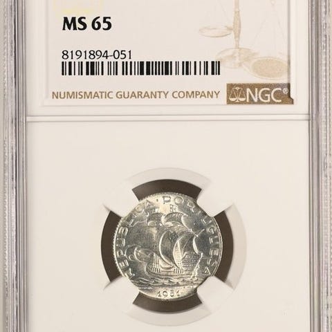 Portugal, Lissabon, 10 Escudos sølvmønt fra 1954, vurderet UNC Details af NGC, med en karavel på fransk siden og en armillær kugle med nationalt våben på bagsiden. Klik på den blå "gå til varen" knap, for at købe eller byde på denne vare. Den samlede pris vil blive vist inden du afgiver dit bud.