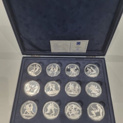 En æske med 18 sølvmønter i 925/1000-sølv, samlet vægt 191 g, temaet sport "Gli azzurri del 1990", UNC-tilstand og ikke udstedt til omløb. Klik på den blå "gå til varen" knap, for at købe eller byde på denne vare. Den samlede pris vil blive vist inden du afgiver dit bud.