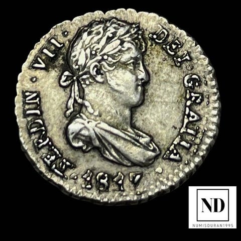 Sølv 1/2 Real fra Lima, 1820, under Ferdinand VII, vægt 1,53 g Ag. Klik på den blå "gå til varen" knap, for at købe eller byde på denne vare. Den samlede pris vil blive vist inden du afgiver dit bud.