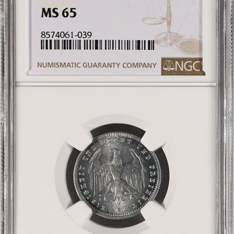 Emissionsmønter fra Weimar-republikken præget i sølv, med et sober og kraftfuldt design, der er typisk for perioden med monetær stabilisering efter hyperinflationen. Forsiden viser værdien DREI MARK og året 1924 omgivet af legendet DEUTSCHES REICH, med en tydelig prægning af punktlinjer. Bagsiden viser en stiliseret tysk ørn med udstrakte vinger, uden krone eller dynastiske skjolde, symbol på den nye republikanske stat. Mønten har en tiltalende sølvfarve med en let ensartet patina, gode reliefs i fjer og legendes, og en meget afbalanceret