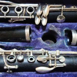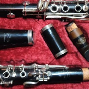 Sib klarinet, 18 nøgler, krop i ebenholt, sølvbelagte nøgler, med dobbelt rør, skumkasse med rengøringsklud, mundstykke, ligatur og ankel.