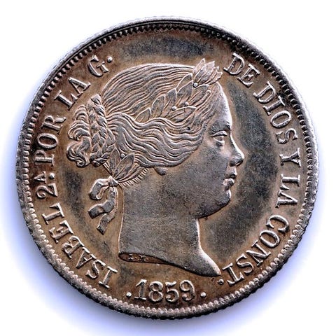 Isabel II sølvmønter 2 reales fra 1853, Barcelona, vejer 2,5 g, stand EBC+/XF+, usædvanligt velbevaret med en del af den oprindelige glans. Klik på den blå "gå til varen" knap, for at købe eller byde på denne vare. Den samlede pris vil blive vist inden du afgiver dit bud.