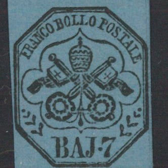 ANTIKE STATER - STATO PONTIFICIO - 50 baj azzurro, sass. nr. 10, ny med fuld originalgummi, defekt, certificeret Manzoni