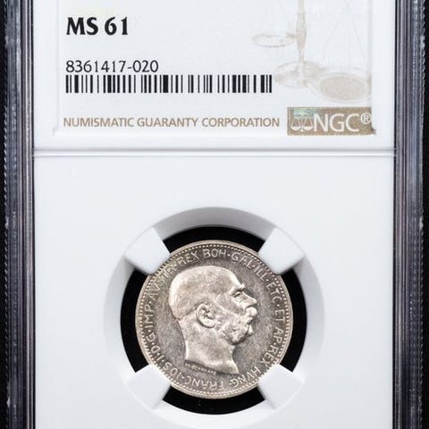 Østrig, sølvmønt på 1 Corona fra 1915 med kejsar Franz Joseph I, MS63-vurderet af NGC. Klik på den blå "gå til varen" knap, for at købe eller byde på denne vare. Den samlede pris vil blive vist inden du afgiver dit bud.