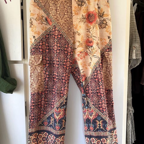 Bukser, Clamal, str. 42, sand, 100 % polyester, Næsten som ny, Str. L/40/42. Meget meget lækre harems agtige bukser i skinnende stof. Bindes ind ved ben. De har nærmest et silkelook og er meget flotte. De har bælteholdere og lukkes med lynlås. Lomme foran og bagved med lynlås. Det gør mig helt ondt at sætte dem til salg - men desværre kan jeg ikke passe dem mere. De er bløde og lækre at have på, så man næsten ikke mærker dem. Fin og intakt stand. Fra ikke ryger hjem. Afhentet eller plus 58 kr. til forpakning og forsendelse med tracking