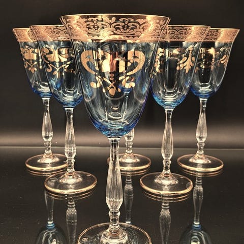 Artemisia, vinglas (6) af ultratyndt krystal, strålende og klangfulde, med en elegant og enkel form, udsmykket i 24 kt guld i lyseblå farve.