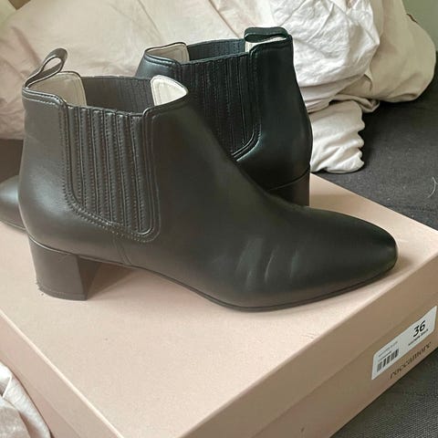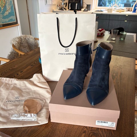 Rochas damestøller i sort velour og patentlæder, EU størrelse 37, 6 cm kattehæl, aldrig båret og med æske, fremstillet i Italien. Klik på den blå "gå til varen" knap, for at købe eller byde på denne vare. Den samlede pris vil blive vist inden du afgiver dit bud.