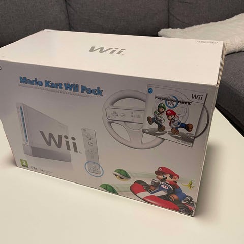 Ud over kassen med konsollen og Mario Kart-spillet lægger jeg en blå controller og to spil i.