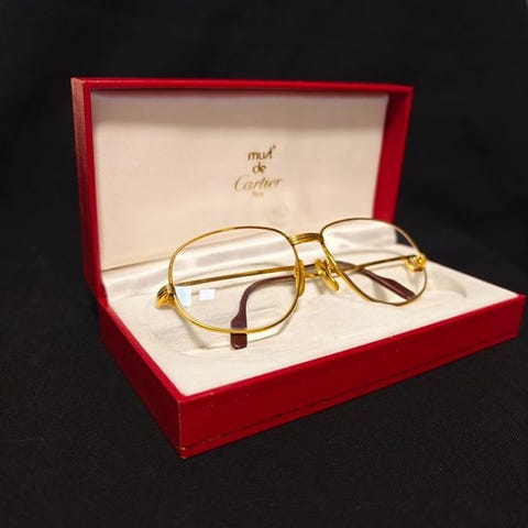 Cartier Aurore vintagebriller fra 1980'erne, pantograferet i guld-platinium, produceret i Frankrig. På brillernes var der oprindeligt monteret korrigerende linser, som er blevet udskiftet med nye solbrillelinser, som vist på billedet, monteret af en betroet optiker, der har foretaget en fuld rengøring med ultralydsudstyr og samtidig leveret en Cartier-etui med rengøringsklud, som ikke er original. Brillerne er i perfekt stand. Se nøje på billederne og mål, da de ikke egner sig til større ansigter.