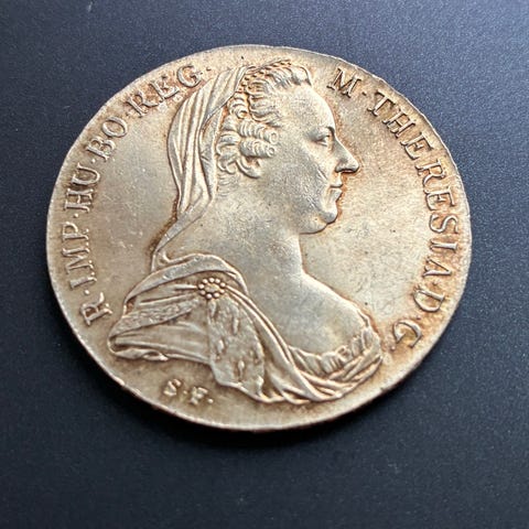 Sølvmønt kendt som Maria Theresa Taler, præget og distribueret i forskellige regioner og perioder som handelsvaluta. Forsiden forestiller et portræt af kejserinde Maria Theresa, mens bagsiden viser våbenskjoldet med den dobbelthovedede ørn.