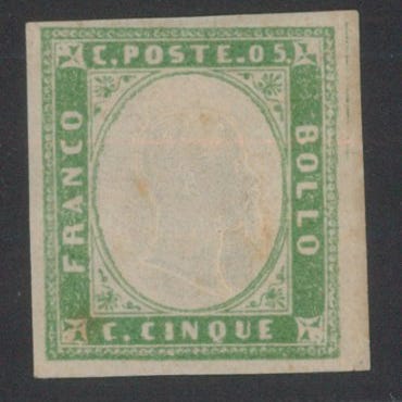 Sardinien, Italienske stater; Sass 4 cv 2500, 5c verde; stemplet; fra 1853. Klik på den blå "gå til varen" knap, for at købe eller byde på denne vare. Den samlede pris vil blive vist inden du afgiver dit bud.