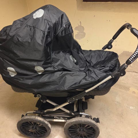 Emmaljunga barnevogn i blå farve. Klassisk liggedel med kaleche og madras. Vognen har stort understel med fire hjul og justerbart håndtag.