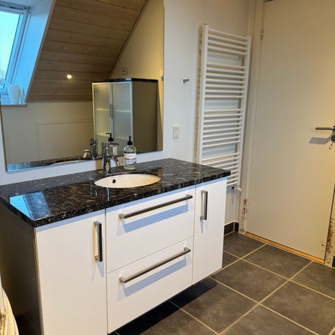 Badeværelsesmøbel med integreret vask og armatur i hvid/beigeoverflade med marmoreret mønster. Ved siden af højskab