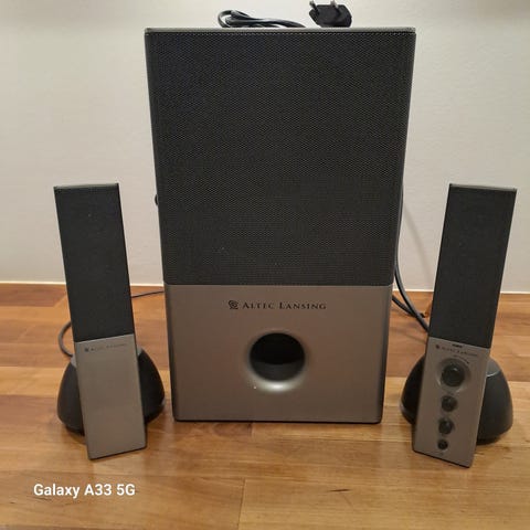 Subwoofer med forstærker og 5 surround-højttalere med fjernbetjening og alle nødvendige ledninger.Hvis du vil have god lyd fra mobil, smart-phone, pc, cd eller lignende, er her et god bud.