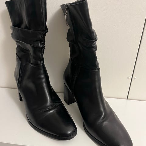 SAND støvler i størrelse 38. Støvlerne er sorte og går til lidt under knæet. Overdelen fremstår i et ruskindslignende materiale med let struktur, og sålen er i et glattere materiale med lav hæl. Velegnet som hverdagssko i overgangsperioder og til brug med både bukser og kjoler.