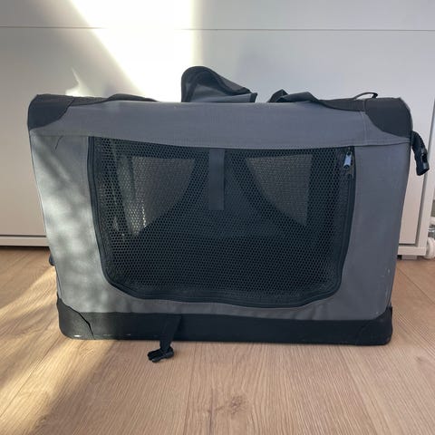 Pet Home transporttaske til kæledyr. Sammenklappelig model i blødt materiale med netpaneler for ventilation og udsyn. Tasken har lynlåsåbning og bærehåndtag, så den er nem at folde ud og pakke sammen igen. Egnet til transport og midlertidigt ophold for mindre kæledyr som hund eller kat, f.eks. i hjemmet, på rejser eller ved besøg hos dyrlæge. Farvekombination i lyse og mørke nuancer.