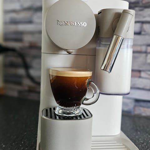 De'Longhi Nespresso Lattissima kaffemaskine er en kapselbaseret espressomaskine i sølvfarve. Maskinen anvender Nespresso-kapsler og har integreret mælkebeholder til tilberedning af drikke som cappuccino og latte macchiato. Fronten har drypbakke og rist til kopper samt betjeningsknapper på toppen til valg af forskellige kaffetyper. Bagsiden rummer aftagelig vandtank. Maskinen er egnet til brug i køkkenet til daglig brygning af espresso og mælkebaserede kaffedrikke med Nespresso-kapsler.
