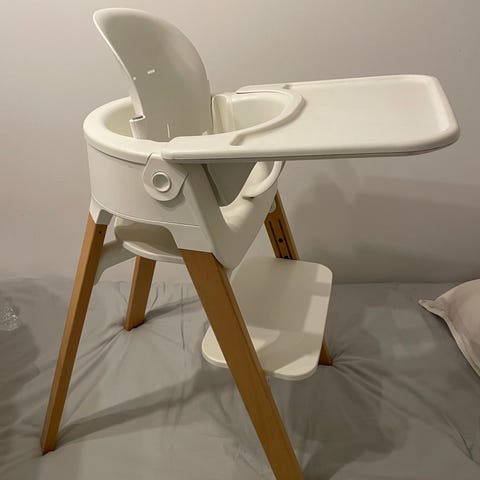 Stokke højstol i sort med naturfarvede ben. Højstolen har integreret sele, aftagelig bakke og justerbar fodstøtte. Sæde og bakke er i plast, mens benene er i træ.