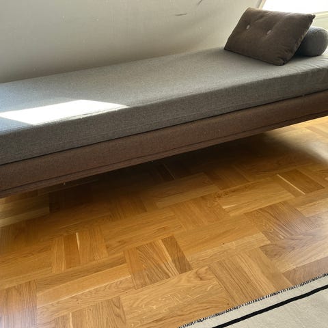 Sofacompany daybed med polstret liggeflade i gråt stof og underdel i mørkt stof. Daybeden står på runde ben i lyst træ. Overfladen har quiltet mønster, som giver et jævnt og stabilt leje. Velegnet som ekstra soveplads eller som liggemøbel i stue, gæsteværelse eller kontor. Størrelse 186x85x40