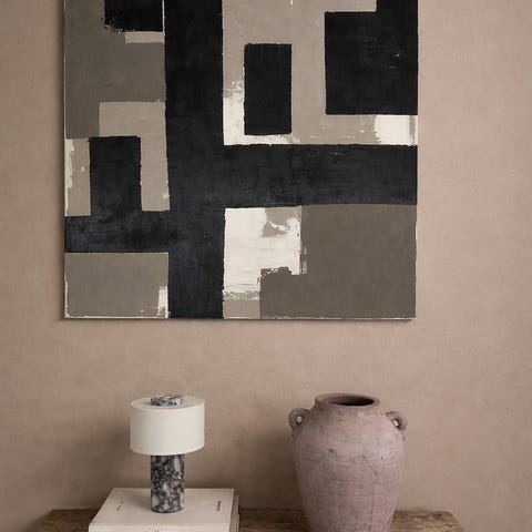Abstrakt maleri med struktureret overflade i lyse nuancer af hvid, grøn, sort og rosa. Maleriet er indrammet med en enkel, mørk ramme. Velegnet som vægdekoration i stue, soveværelse eller kontor, hvor der ønskes et moderne og kunstnerisk udtryk.