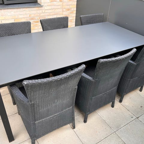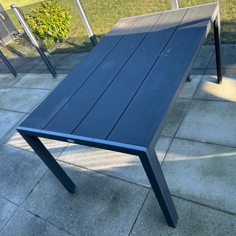 Fremstår yderst pænt og velholdt, men har få brugsspor. Bordet sælges med 4 tilhørende havestole.