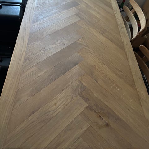 Hjemmebygget spisebord i sildebensmønster af egetræ, med en krydsfinerplade under. Tilhørende bordben, som er specialfremstillet til bordet og malet hvid. Bordet er behandlet med mat klar lak.