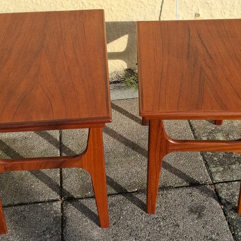 Sidebord med tre plader af teaktræ, ben i bejdset bøgetræ. Designet og produceret af Poul Hundevad.